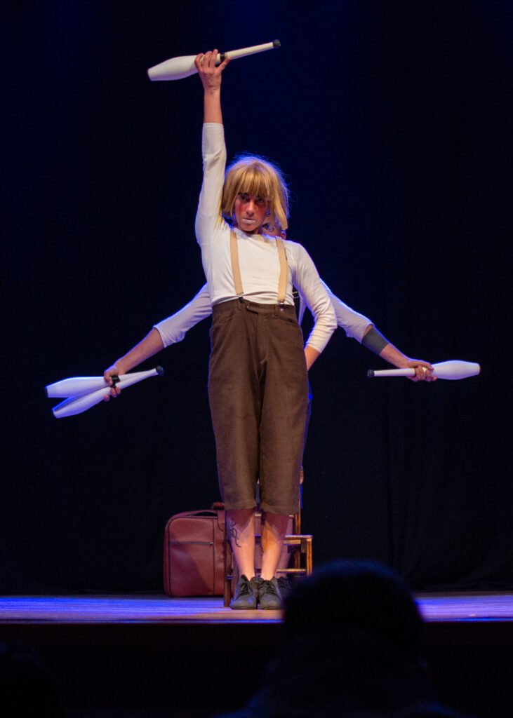 Mi búsqueda artística se centra en el juego, el ritmo y la conexión con el público. Trabajo desde el clown, los malabares y la manipulación de objetos, incorporando también el equilibrio en zancos y monociclo, y el lenguaje de la percusión como parte de la escena.